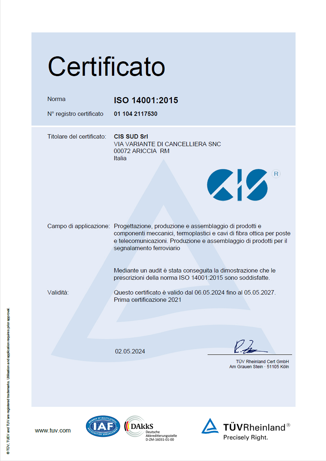 progettazione, produzione e assemblaggio di prodotti e componenti meccanici, termoplastici e cavi in fibra ottica per poste e TLC, produzione e assemblaggio di prodotti per il segnalamento ferroviario con sistema di gestione certificato secondo la norma uni en iso 14001.